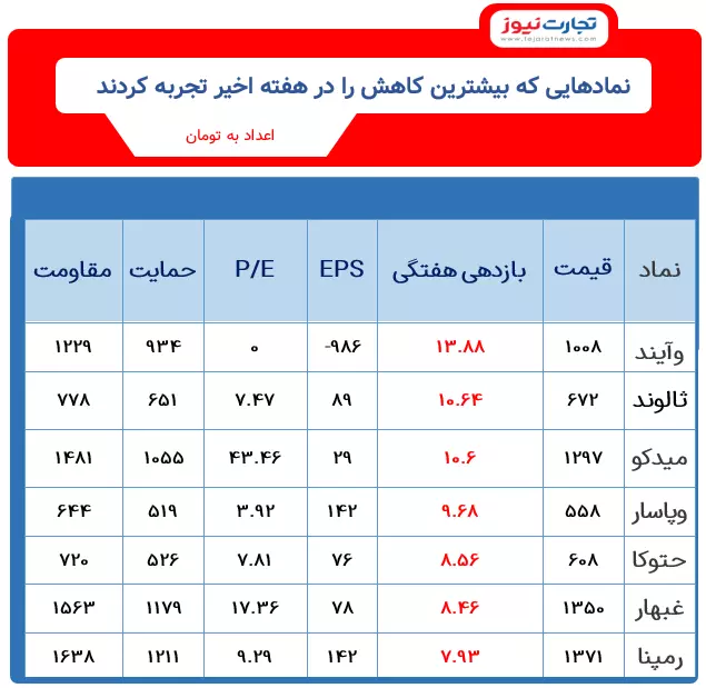 بررسی معاملات هفته گذشته بازار سرمایه حاکی از بازدهی منفی سهام بسیاری از شرکتها بوده، از این رو این گزارش به بررسی سهمهایی که در یک هفته اخیر بیشترین کاهش قیمتی را داشتهاند میپردازد.