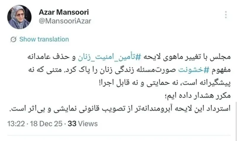 آذر منصوری خواستار استرداد لایحه تأمین امنیت زنان شد