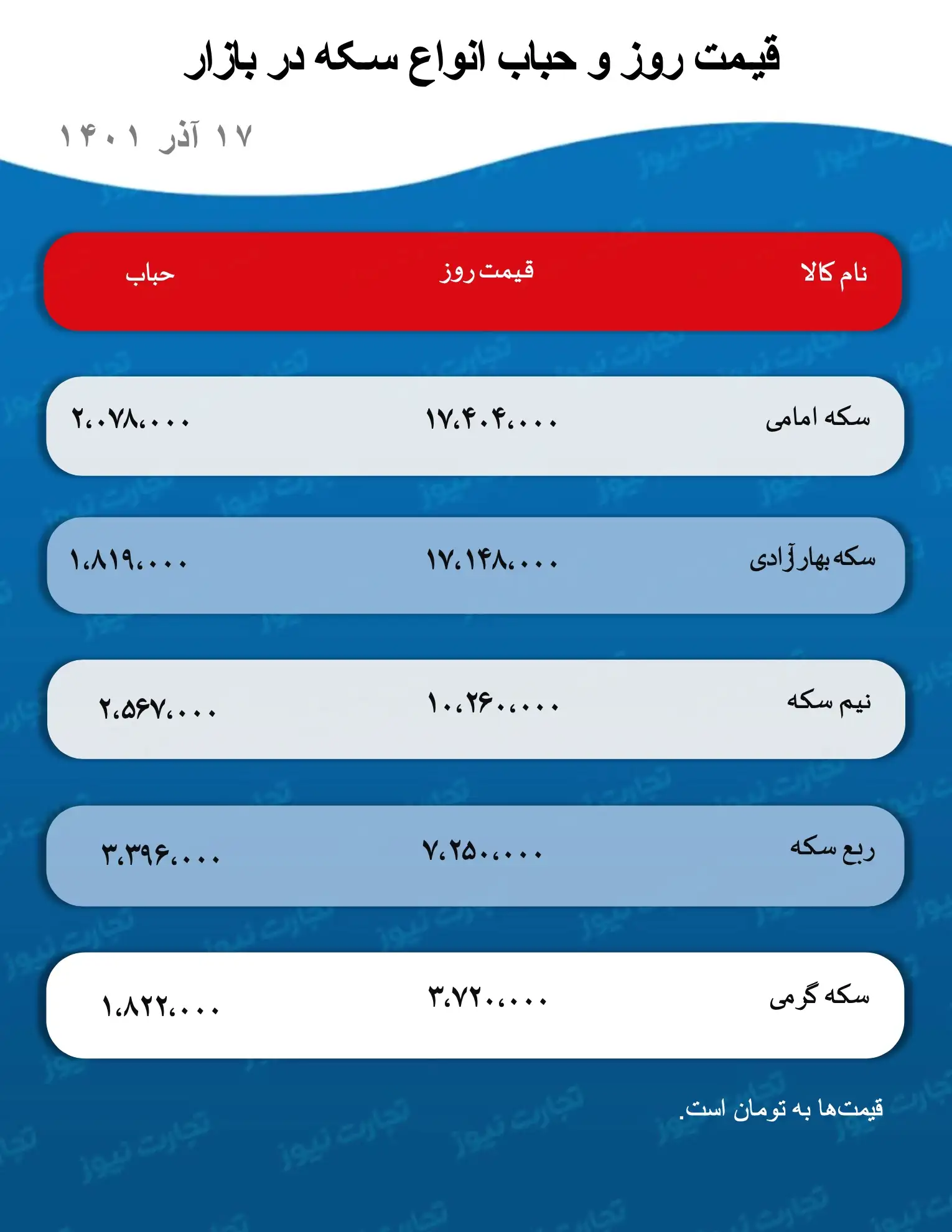 در آخرین معامله روز پنجشنبه ۱۷ آذر ۱۴۰۱ قیمت سکه امامی در پله چهارم کانال ۱۷ میلیون تومانی و با نرخ مشخص ۱۷ میلیون و ۴۰۴ هزار تومان معامله شد.