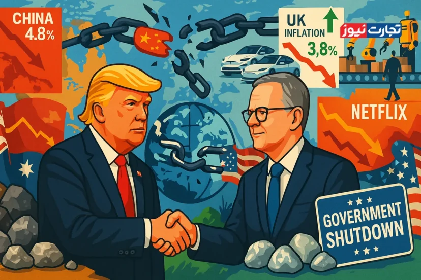 به گزارش تجارت نیوز، دونالد ترامپ با نخستوزیر استرالیا توافقی امضا کرد که دسترسی آمریکا به منابع حیاتی معدنی آن کشور را ممکن میسازد. این اقدام در راستای کاهش وابستگی زنجیره تامین به چین بود. همزمان، اقتصاد چین در سهماهه سوم سال تنها ۴.۸ درصد رشد کرد که کمرمقترین عملکرد آن در یک سال گذشته بوده است. در بریتانیا نیز نرخ تورم برای سومین ماه متوالی روی ۳.۸ درصد ثابت ماند و انتظار میرود بانک مرکزی نرخ بهره را تا پایان سال کاهش دهد.
