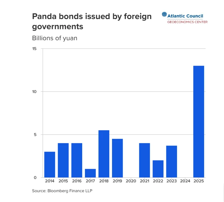 لیزه د کرویف، دستیار برنامه در ابتکار سیاست اقتصادی مرکز اقتصاد جغرافیایی شورای آتلانتیک براین باور است که در سال ۲۰۲۵، دولتهای خارجی معادل ۱۳ میلیارد یوان اوراق قرضه پاندا صادر کردند (اوراق قرضه با واحد یوان که توسط وامگیرندگان خارجی در بازار داخلی چین فروخته میشود.) این میزان در مقایسه با بازار وسیع اوراق قرضه دلاری محدود باقی خواهد ماند، اما افزایش بدهیهای دولتی یوان نسبت به سالهای گذشته همچنان قابل توجه است.