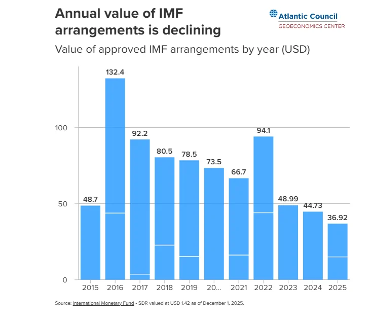 بارت پیاسکی، معاون مدیر در مرکز اقتصاد جغرافیایی شورای آتلانتیک تاکید دارد، از ژانویه تا اکتبر ۲۰۲۵، هیات اجرایی صندوق بینالمللی پول (IMF) توافقات مالی جدیدی برای ده کشور عضو تایید کرد: آرژانتین، السالوادور، کاستاریکا، مراکش، چاد، جمهوری دموکراتیک کنگو، مصر، گامبیا، اردن، و پاکستان. تسهیلات ۲۰ میلیارد دلاری «Extended Fund Facility» که صندوق بینالمللی پول به آرژانتین اعطا کرد—تدبیری برای کشورهایی با چالشهای عمیق و ساختاری در تراز پرداختها—نزدیک به ۶۰ درصد از کل ارزش وامهای تایید شده توسط IMF در این سال را شامل میشود.