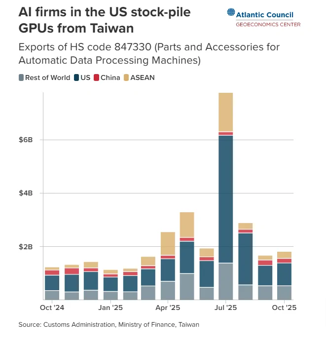به نوشته جسی یین، معاون مدیر در مرکز اقتصاد جغرافیایی شورای آتلانتیک ایالات متحده تنها ۴.۸۴ میلیارد دلار قطعات و لوازم جانبی ماشینهای پردازش داده خودکار را در شش ماه اول سال ۲۰۲۵ از تایوان وارد کرده است. پس در ژوئیه چه اتفاقی افتاد؟ افزایش شدید واردات واحدهای پردازش گرافیکی پیشرفته بخش عمدهای از این جهش را تشکیل میدهد، چرا که شرکتهای هوش مصنوعی در ایالات متحده برای خرید این مؤلفه حیاتی قبل از اعمال تعرفه ۲۰ درصدی ایالات متحده بر تایوان که در آگوست اجرایی شد، شتاب داشتند.