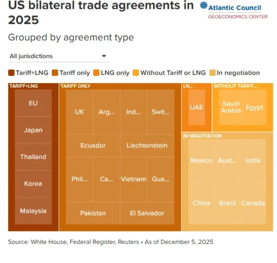 این دو قرارداد تعرفهای و گاز طبیعی مایع این اطمینان را ایجاد میکنند که منافع اقتصادی و ژئوپولیتیکی اعضای گروه ۷ در برابر روسیه و چین همراستا باقی بماند. با توجه به اینکه توافقنامه ایالات متحده–مکزیک–کانادا (USMCA) در سال ۲۰۲۶ بازنگری خواهد شد، طبیعی است که کانادا و مکزیک در سال ۲۰۲۵ هیچ قرارداد الزامآوری با ایالات متحده امضا نکردهاند.