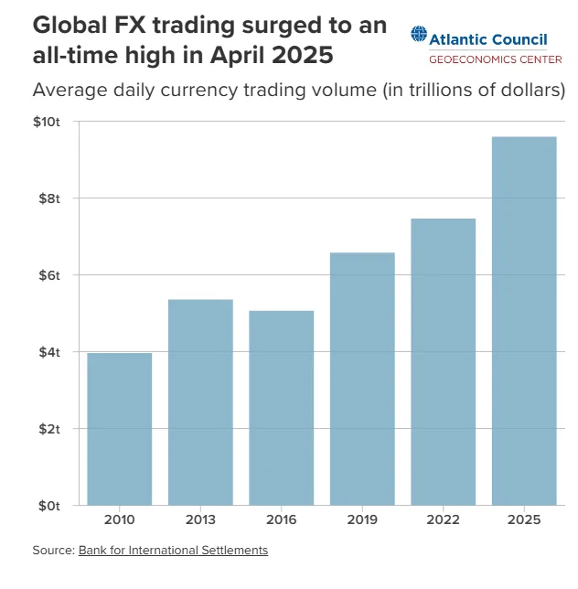 آلیشا چنگانی، معاون مدیر در مرکز اقتصاد جغرافیایی شورای آتلانتیک با استناد به نظرسنجی سهساله BIS تاکید دارد که در سال ۲۰۲۵، معاملات ارزی جهانی به رکورد جدیدی رسید، با حجم معاملات روزانه متوسط حدود ۹.۶ تریلیون دلار در آوریل، که از حدود ۷.۵ تریلیون دلار در سال ۲۰۲۲ افزایش یافته است.
