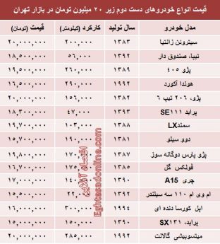 آنچه در زیر میآید قیمت روز انواع خودروهای سواری دست دوم است که کمتر از 20 میلیون تومان در سطح بازار معامله میشود.