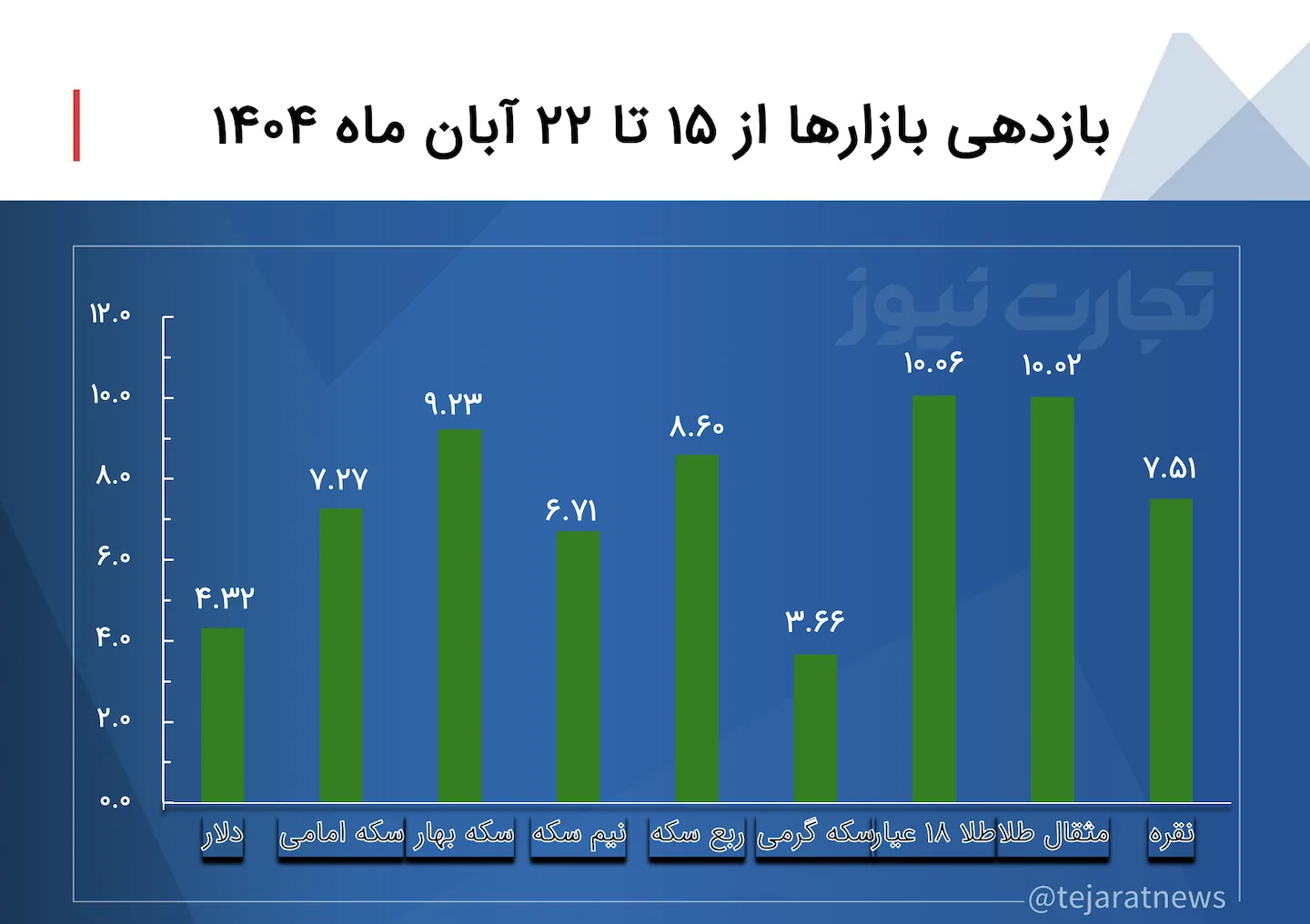 بازدهی بازارها در هفته سوم آبان ۱۴۰۴ / بازگشت تورم؛ جهش دلار و صعود کم‌سابقه طلا + نمودار