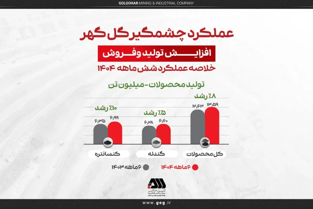 بر پایه این گزارش علاوه بر بالا رفتن حجم و مبلغ فروش محصولات در ۶ ماهه اول سال ۱۴۰۴، تولید محصولات شرکت گل گهر نظیر گندله و کنسانتره نیز در کل با افزایش ۸ درصدی روبرو بوده است. بر این اساس تولید کنسانتره با افزایش ۱۰ درصدی به ۶ میلیون و ۹۸۰ هزار تن و تولید گندله با افزایش ۵ درصدی به ۶ میلیون و ۶۰۰ هزار تن رسیده است.
