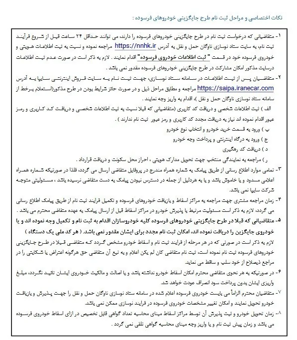 متقاضــیان پــس از ثبــت اطلاعــات در ســامانه ســتاد نوســازی، جهــت ثبــت نــام بــه ســامانه فــروش اینترنتــی ســایپا بــه آدرس saipa.iranecar.com مراجعه و مطابق مراحل ذیل در صورت حائز شرایط بودن در طرح مذکور (اسـتعلام بـرخط از سامانه ستاد نوسازی ناوگان حمل و نقل)، اقدام به واریز وجه کنند.