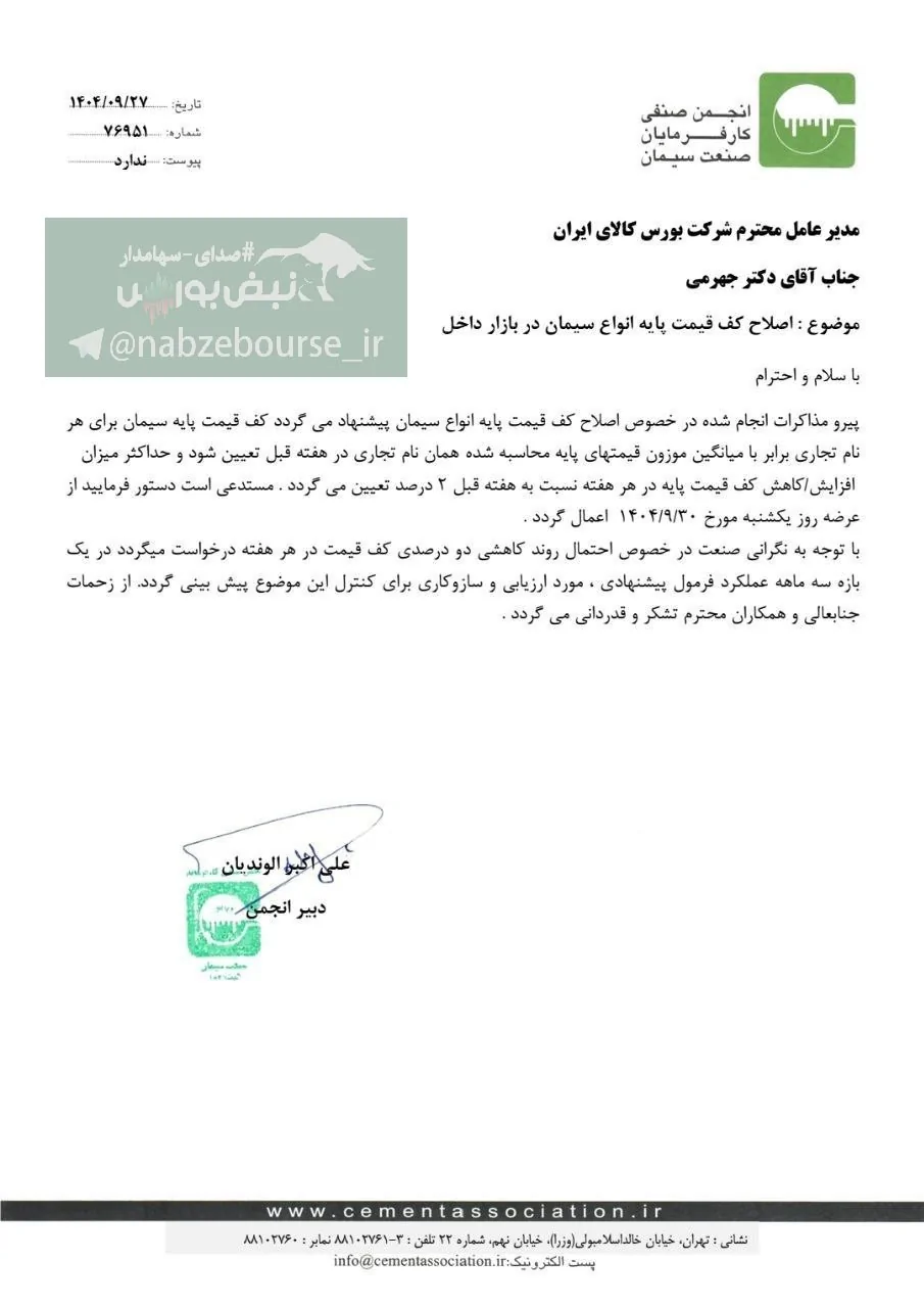 انجمن صنفی کارفرمایان سیمان جهت اصلاح قیمت پایه سیمان درخواست رسمی کرد.