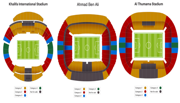 با توجه به توضیحات بالا،‌ موقعیت بلیط های کتگوری یک تا چهار در ورزشگاه های الثمامه، احمد بن علی و الخلیفه بصورت زیر می باشد: