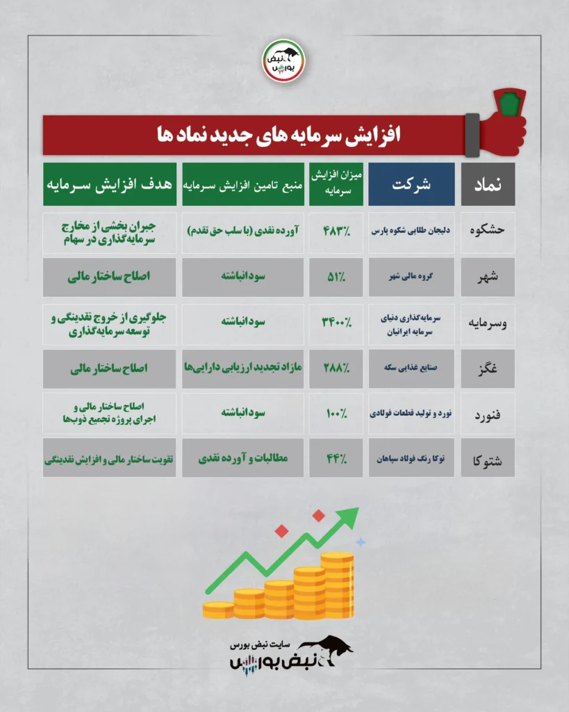به گزارش تجارت نیوز، در هفته پایانی مهرماه موج جدیدی از افزایش سرمایه‌ها در بازار سرمایه به جریان افتاده است. شرکت‌های «دلیجان طلایی شکوه پارس (حشکوه)»، «گروه مالی شهر»، «سرمایه‌گذاری دنیای سرمایه ایرانیان (وسرمایه)»، «صنایع غذایی سکه (غگز)»، «نورد و تولید قطعات فولادی (فنورد)» و «توکا رنگ فولاد سپاهان (شتوکا)» به ترتیب از افزایش سرمایه‌های چشمگیر ۴۸۳، ۵۱، ۳۴۰۰، ۲۸۸، ۱۰۰ و ۴۴ درصدی خبر دادند.