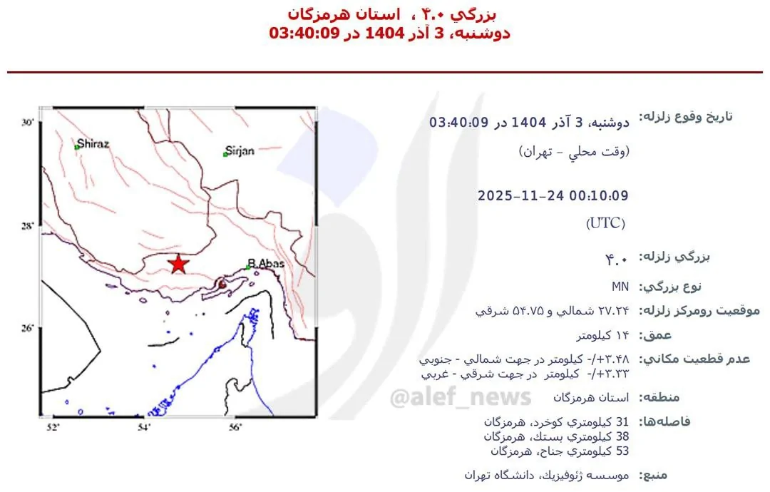 زمینلرزه ۴ ریشتری در کوخرد هرمزگان