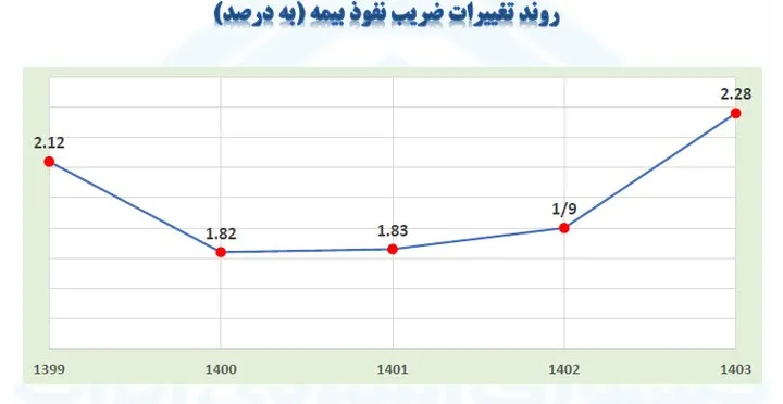 همچنین، در سال گذشته، سرانه حق بیمه با ضریب ۵۶.۱، به پنج میلیون و ۲۱۰ هزار تومان به ازای هر شخص رسید و ضریب نفوذ بیمه یا نسبت حق بیمه تولیدی به تولید ناخالص داخلی به ۲.۳ درصد رسید که نسبت به سال قبل خود (۱۴۰۲) حدود ۰.۴ درصد افزایش داشته است.