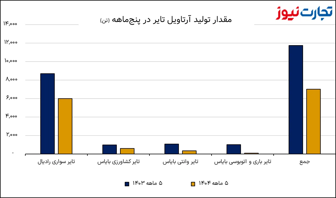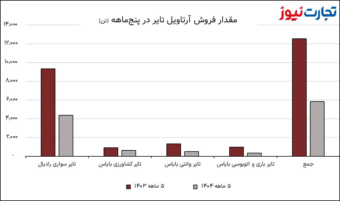 در میان محصولات، تایر سواری رادیال با افت ۵۳ درصدی بیشترین سهم را در این کاهش داشته است. تایر وانتی بایاس با افت ۶۲ درصدی و تایر باری و اتوبوسی با افت ۶۶ درصدی نیز ضربه بزرگی به عملکرد فروش وارد کرده‌اند. حتی تایر کشاورزی بایاس نیز از این روند مستثنی نبوده و با افت ۳۲ درصدی مواجه شده است.