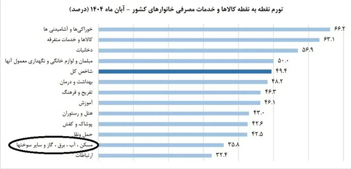 مرکز آمار نیز تورم ماهانه مسکن، اجاره‌بها، آب، برق، گاز و سایر سوخت‌ها در آبان ماه را ۳ درصد اعلام کرد. تورم نقطه به نقطه این بخش که تفاوت قیمت نسبت به ماه مشابه سال قبل را نشان می‌دهد نیز ۳۵.۸ درصد اعلام شد. در حالی که تورم نقطه به نقطه عمومی ۴۹.۴ درصد بوده که گویای است هزینه مسکن ۱۳.۶ درصد کمتر از هزینه سایر کالاها بوده است.
