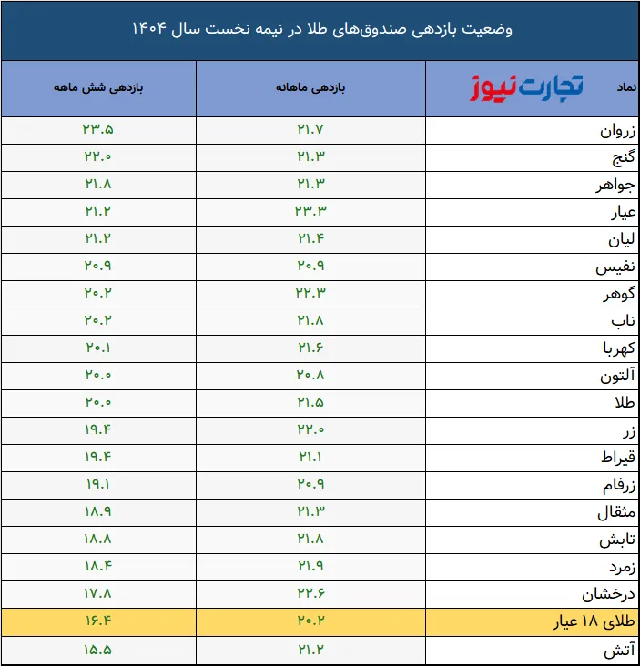 در میان صندوق‌های فعال، صندوق زروان با بازدهی 6 ماهه 23.5 درصدی در صدر جدول قرار گرفت و به عنوان موفق‌ترین صندوق طلا در نیم سال اول 1404 شناخته شد. پس از آن، صندوق‌های گنج با 22 درصد، جواهر با 21.8 درصد و عیار و لیان هر یک با 21.2 درصد در جایگاه‌های بعدی قرار گرفتند.