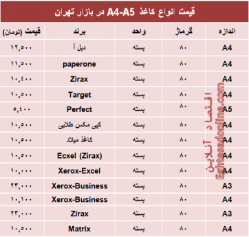 تجارت نیوز: آنچه در زیر می آید جدول قیمت انواع کاغذ A4 و A5 در بازار تهران است؛