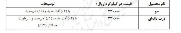 (1) قیمت های تضمینی محصولات جو و ذرت دانه ای برای سال زراعی 1405-1404 به شرح جدول ذیل تعیین می گردد:
