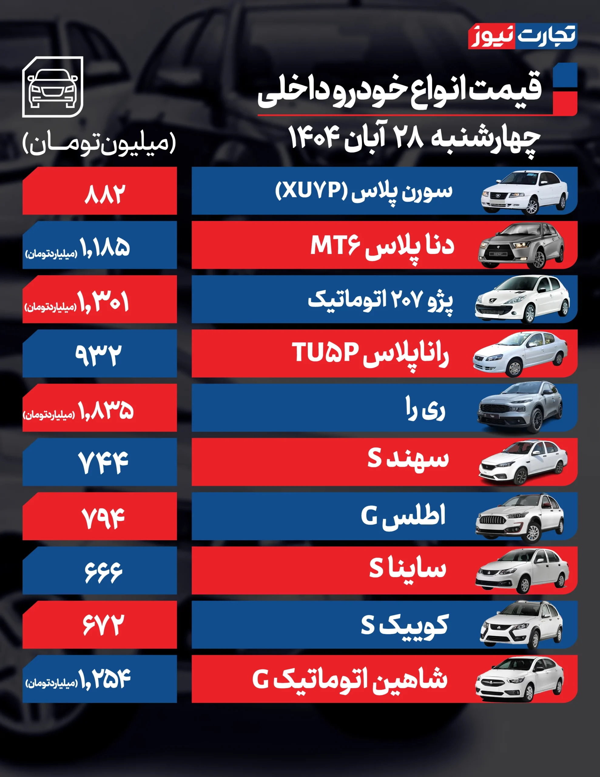 قیمت خودرو امروز 28 آبان 1404 / بازار خودرو در مسیر ثبات قرار گرفت؟ + جدول