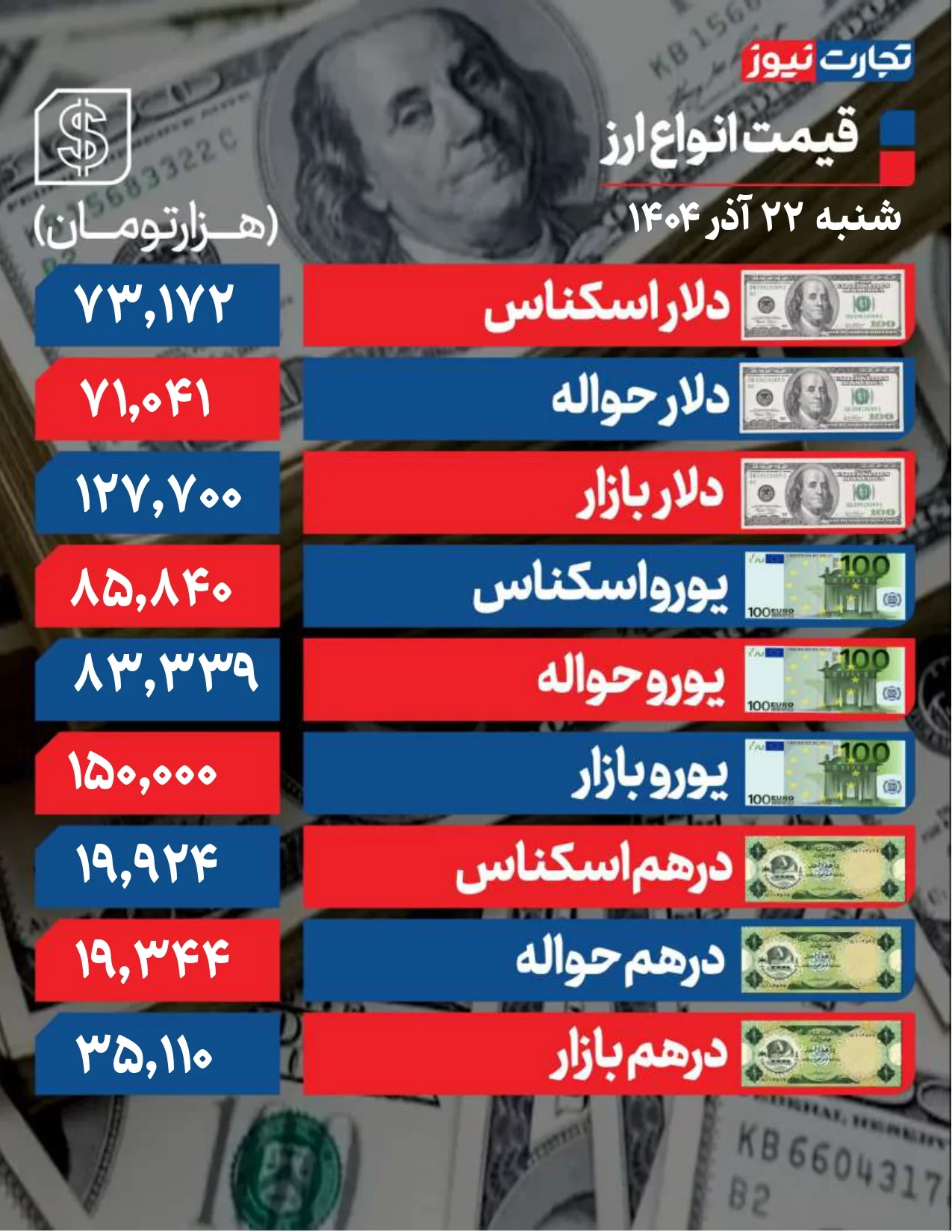 درهم امارات امروز روی رقم 35 هزار و 110 تومان معامله می‌شود. تتر روی رقم 128 هزار و 287 تومان در حال معامله است. پوند انگلیس با عبور از کانال 170 هزار تومانی روی رقم 170 هزار و 380 تومان قرار گرفت. یورو نیز با رقم 150 هزار تومان معامله می‌شود.