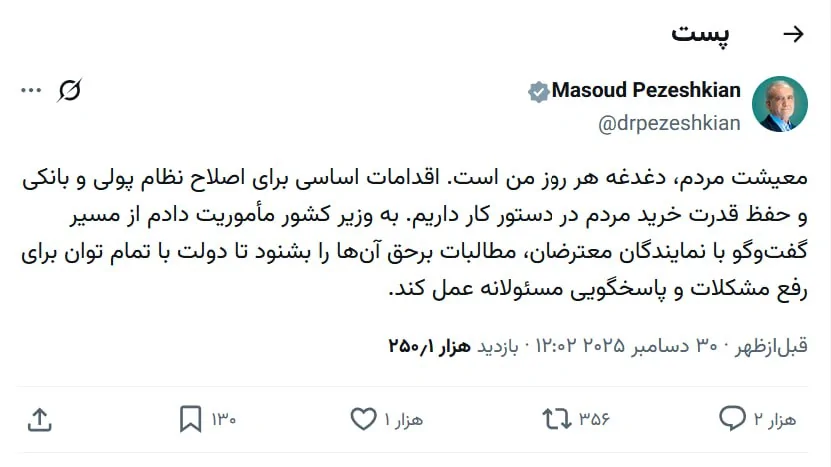 به گزارش تجارت نیوز، مسعود پزشکیان دوشنبه شب هشتم دی ۱۴۰۴ در شبکه اجتماعی ایکس نوشت: معیشت مردم، دغدغه هر روز من است. اقدامات اساسی برای اصلاح نظام پولی و بانکی و حفظ قدرت خرید مردم در دستور کار داریم.