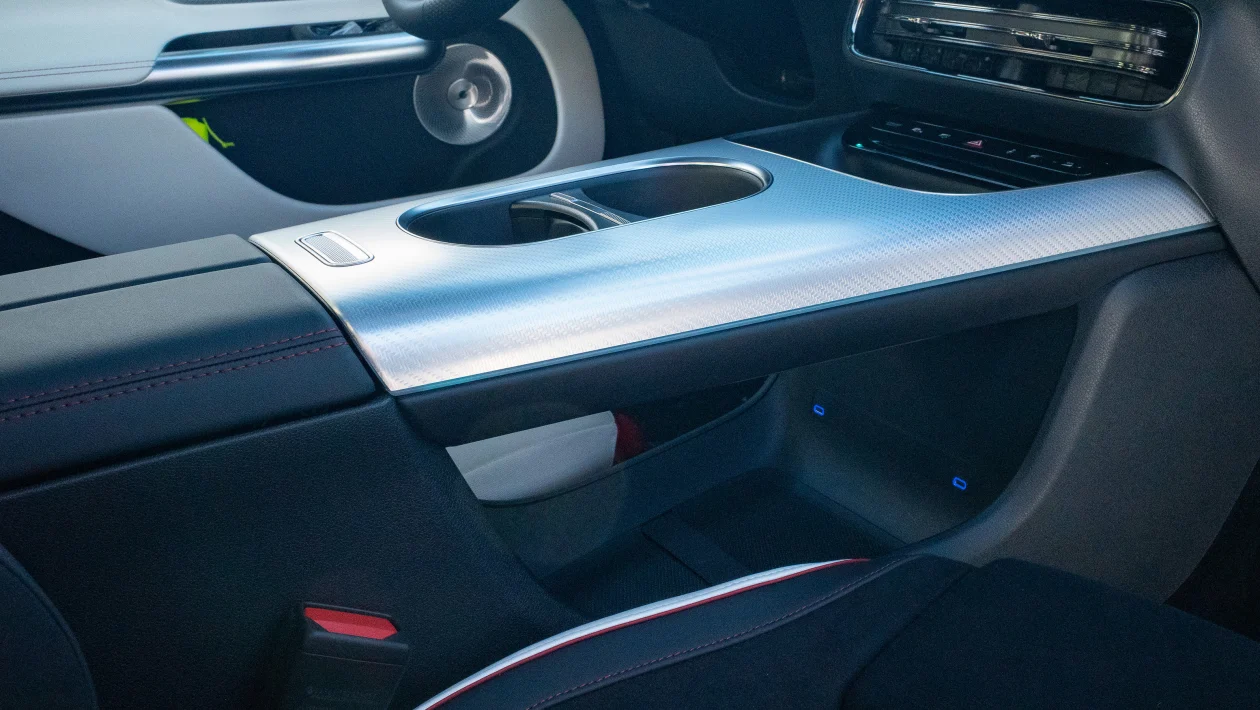 در زیر نمایشگر اصلی، یک کنسول معلق مرکزی قرار دارد که تعدادی از معدود دکمههای فیزیکی GLB روی آن دیده میشود و فضایی برای قرار دادن گوشی هوشمند هم در نظر گرفته شده است. شارژر بیسیم بهعنوان آپشن عرضه میشود. زیر این بخش نیز یک فضای بزرگ و باز برای نگهداری وسایل ریز و درشت تعبیه شده است.