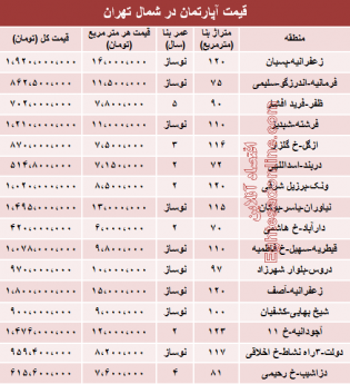 آنچه در زیر می آید جدول قیمت معاملات انجام شده آپارتمان در شمال تهران در فروردین 95 است.