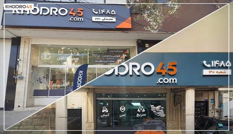 شرکت خودرو45 به منظور ارائه راحتتر و سریعتر خدمات به فروشندگان و خریداران خودرو کارکرده، در حال حاضر 19 شعبه فعال در تهران و سایر شهرها دارد. شعب فعالی همچون مشهد، اصفهان، شیراز، آمل، اهواز و کرج در حال حاضر و در راستای ایجاد بستری امن برای فروشندگان خودرو به انجام خدمات فروش خودرو به مشتریان فعال هستند.