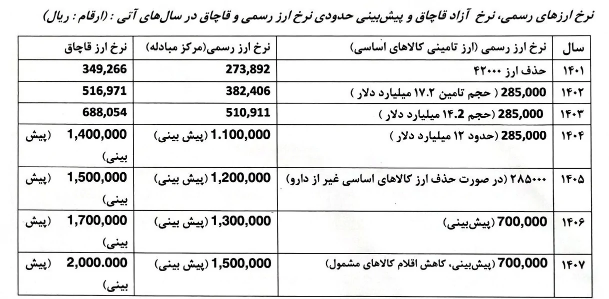 افزون بر این، برآورد تحلیلی و پیشبینی ما از روند احتمالی نرخ ارز رسمی و نرخ بازار آزاد قاچاق در سالهای آتی – در فرض تداوم چرخه مخرب «نرخ ارز – تورم» – نیز منعکس گردیده است.