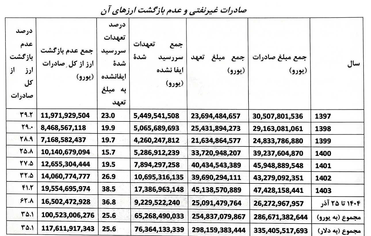 افزون بر مراتب فوق، بر اساس اطلاعات و دادههای موجود از ابتدای سال ۱۳۹۷ تاکنون (تا تاریخ ۲۵ آذرماه ۱۴۰۴) بالغ بر ۱۱۷ میلیارد دلار از ارزهای حاصل از صادرات غیرنفتی به چرخه رسمی اقتصاد کشور بازنگشته است. این وضعیت بهطور مستقیم موجب شکلگیری صفهای طولانی و اختلالات مستمر در فرآیند تخصیص ارز برای واردات نهادههای تولیدی و کالاهای مورد نیاز بخش مولد شده است. در همین حال متأسفانه بانک مرکزی تحت تأثیر فشارهای وارده از سوی اتاق بازرگانی ایران و نیز با هدف اعلامی تشویق صادرکنندگان به ایفای تعهدات ارزی و بازگشت ارزهای صادراتی، بهصورت مستمر اقدام به افزایش نرخ ارز رسمی نموده است؛ حال آنکه همانگونه که پیشتر نیز تصریح شد، شواهد و نتایج عملی حاکی از آن است که این رویکرد سیاستی در عمل بر تشدید بیثباتی ارزی و تعمیق مشکلات موجود افزوده است.