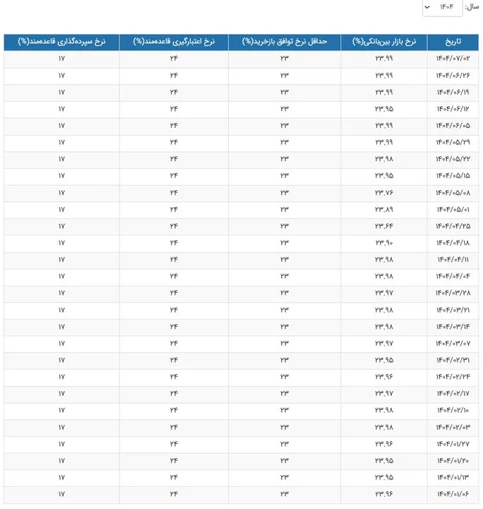 طبق داده‌های موجود از نرخ بهره بین بانکی آخرین بار در تابستان سال گذشته (۱۴۰۳) بود که نرخ بهره بین بانکی در کانال ۲۳.۶ درصد تثبیت شده بود و در حال حاظر این نرخ مجددا به کانال ۲۳.۶ درصد بازگشته است.