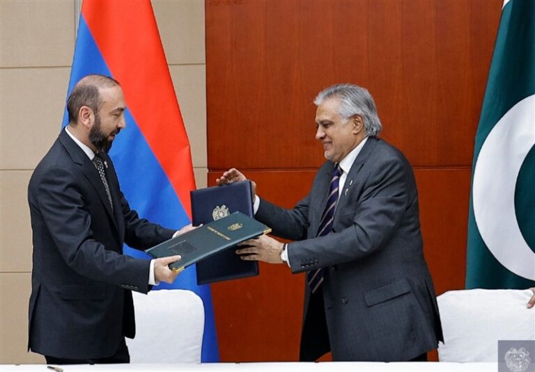 به گزارش تجارت نیوز، وزارت امور خارجه ارمنستان اعلام کرد آرارات میرزویان و محمد اسحاق دار، وزرای خارجه ارمنستان و پاکستان، در چین بیانیه مشترکی را در خصوص برقراری روابط دیپلماتیک میان دو کشور امضا کردند.