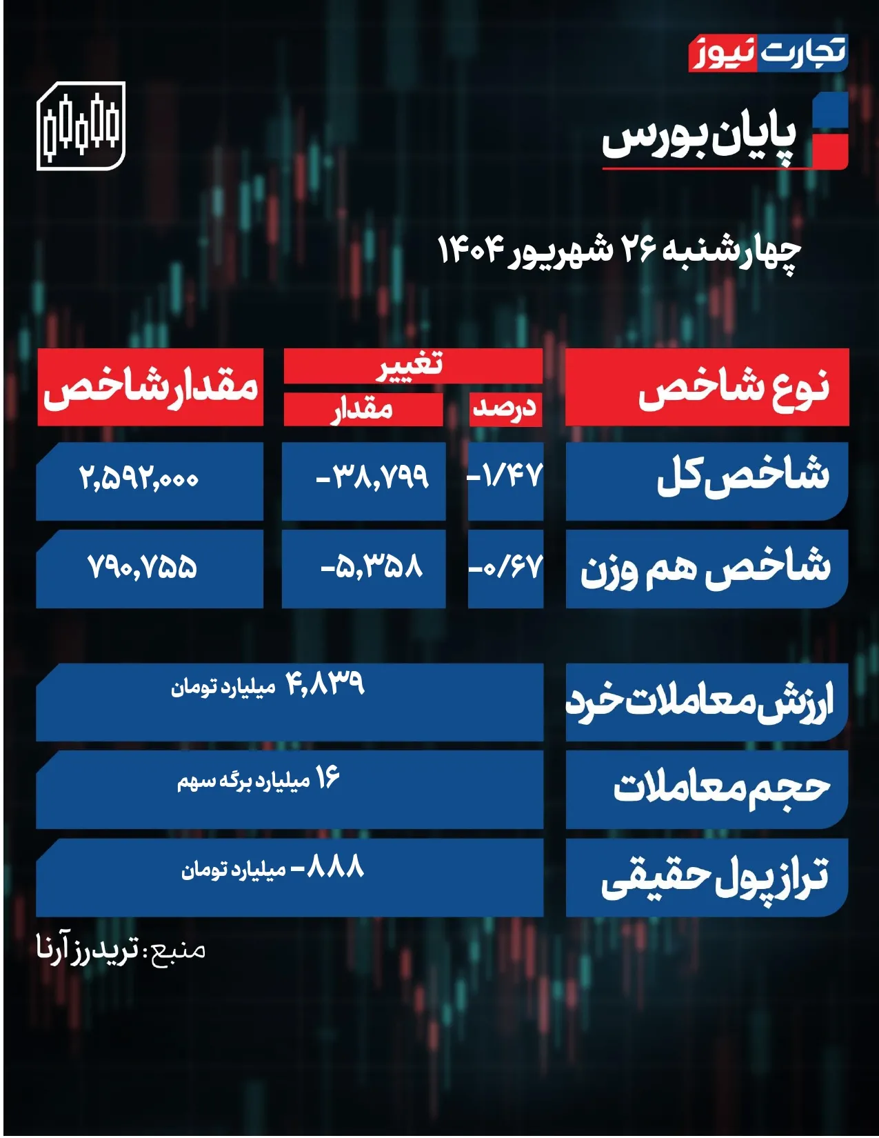 پایان بورس امروز چهارشنبه 26 شهریور 1404 / پایان‌بندی سرخ بازار سهام