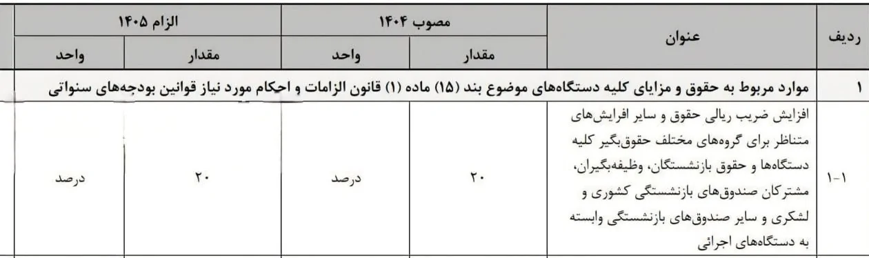 به گزارش تجارت نیوز، لایحه بودجه سال 1405 کل کشور با پیشبینی افزایش حقوق کارکنان ارائه شد. بر اساس این لایحه، میزان افزایش ضریب ریالی حقوق سایر افزایش متناظر برای گروههای مختلف حقوق بگیر کلیه دستگاههای اجرایی 20 درصد تعیین شده است.
