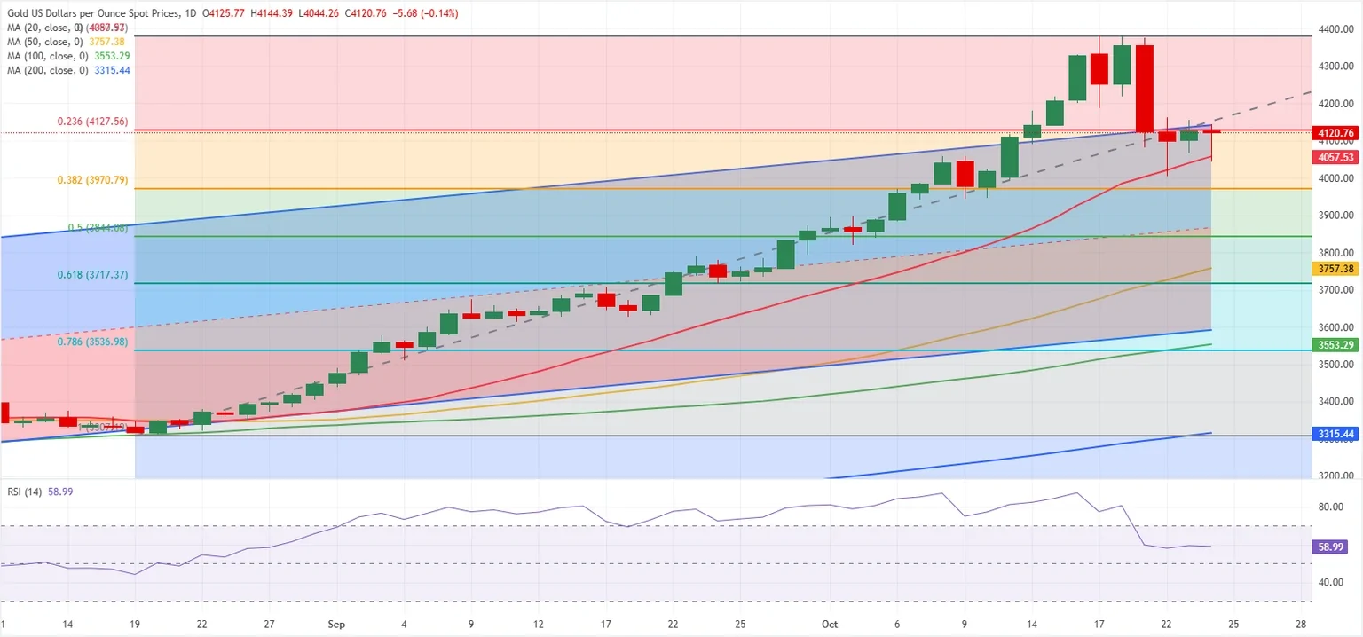 از منظر تکنیکال طلا پس از چندین هفته‌ صعود بی‌وقفه، وارد محدوده اصلاح شده است. شاخص قدرت نسبی (RSI) در نمودار روزانه به زیر ۶۰ سقوط کرده که نشان‌دهنده خروج از وضعیت اشباع خرید است. در عین حال، قیمت به داخل کانال صعودی 6 ‌ماهه بازگشته و نشان می‌دهد مومنتوم صعودی کاهش یافته اما ساختار بلندمدت هنوز افزایشی است.