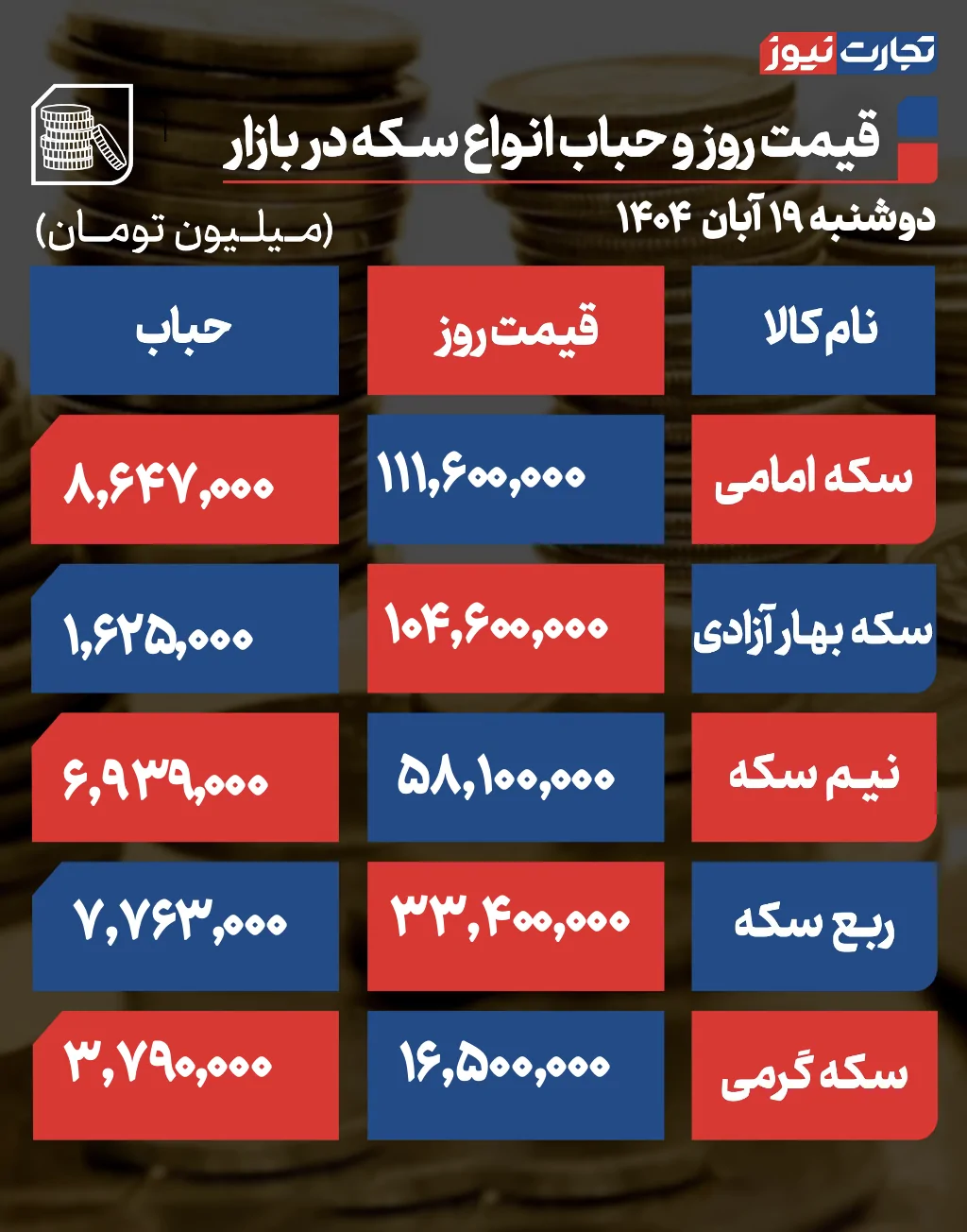 قیمت سکه امامی روز دوشنبه با رشد ۸۸۰ هزار تومانی با قیمت ۱۱۱ میلیون و ۶۰۰ هزار تومانی معامله شد. سکه‌ بهار آزادی با رشد ۷۸۹ هزار تومانی روی رقم ۱۰۴ میلیون و ۶۰۰ هزار تومانی ایستاد.