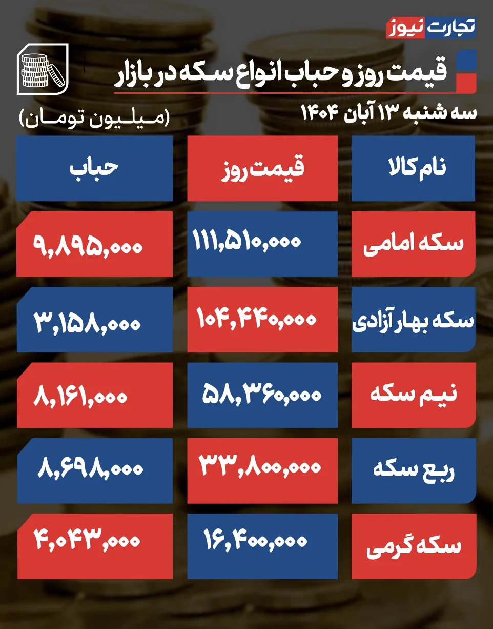 قیمت سکه امامی روز سهشنبه با رشد ۶۰۵ هزار تومانی با قیمت ۱۱۱ میلیون و ۵۱۰ هزار تومانی معامله شد. سکه بهار آزادی با رشد ۲۱۰ هزار تومانی روی رقم ۱۰۴ میلیون و ۴۴۰ هزار تومانی ایستاد.