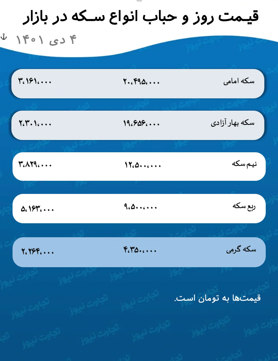 امروز یکشنبه ۴ دی ۱۴۰۱، قیمت سکه امامی سقف جدیدی زد و با بیش از ۶۰۰ هزار تومان افزایش قیمت به میانه کانال ۲۰ میلیون تومانی رسید.