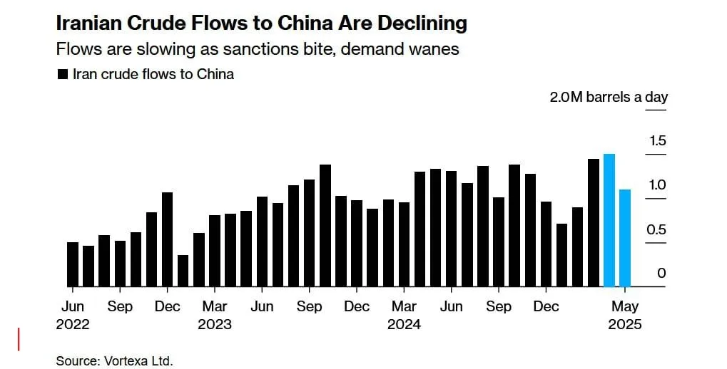 طبق آمار ورتکسا، فروش نفت ایران به چین در می سال گذشته ۱.۳ میلیون بشکه در روز ثبت شده و اکنون ۲۰۰ هزار بشکه نسبت به سال گذشته کمتر شده.
