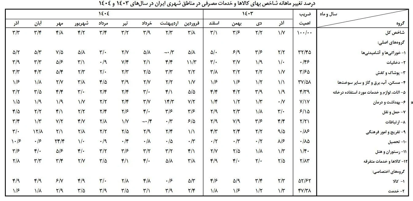 بر اساس این گزارش، شاخص بهای کالاها و خدمات مصرفی در آذرماه 1404 به عدد 486.9 رسیده که نسبت به ماه قبل 3.3 درصد افزایش نشان میدهد. هرچند این میزان افزایش ماهانه در نگاه اول ممکن است کمتر از برخی مقاطع پرنوسان سالهای گذشته به نظر برسد، اما مقایسه نقطهبهنقطه حاکی از رشد 49.9 درصدی این شاخص نسبت به آذرماه سال قبل است؛ رقمی که از تداوم تورم بالا و مزمن در اقتصاد حکایت دارد. در همین حال، نرخ تورم دوازدهماهه منتهی به آذرماه 1404 نیز به 42.4 درصد رسیده که بیانگر ماندگاری تورم در کانال بالای 40 درصد است.