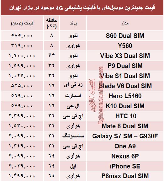 آنچه در زیر میآید قیمت جدیدترین انواع موبایلهای با قابلیت پشتیبانی 4G در سطح بازار تهران است؛ تجارت نیوز: آنچه در زیر میآید قیمت جدیدترین انواع موبایلهای با قابلیت پشتیبانی 4G در سطح بازار تهران است؛