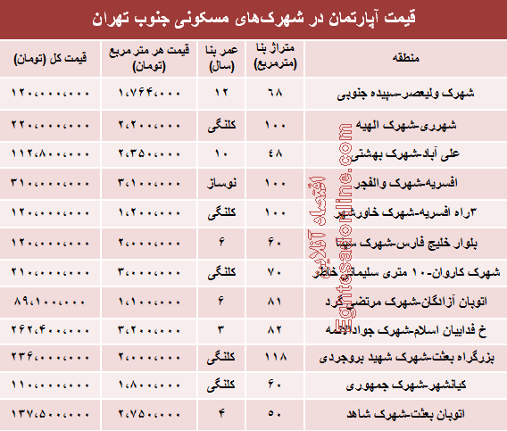 مظنه قیمت آپارتمان در شهرک های جنوبی تهران + جدول