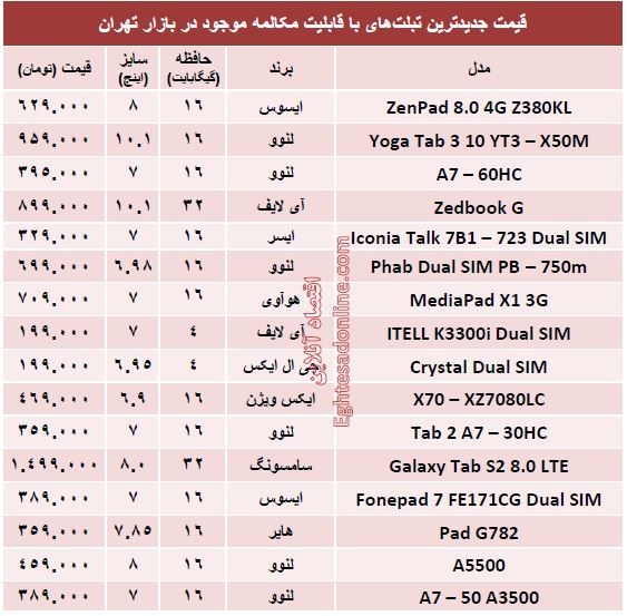 قیمت تبلت‌های‌ جدید با قابلیت مکالمه+جدول