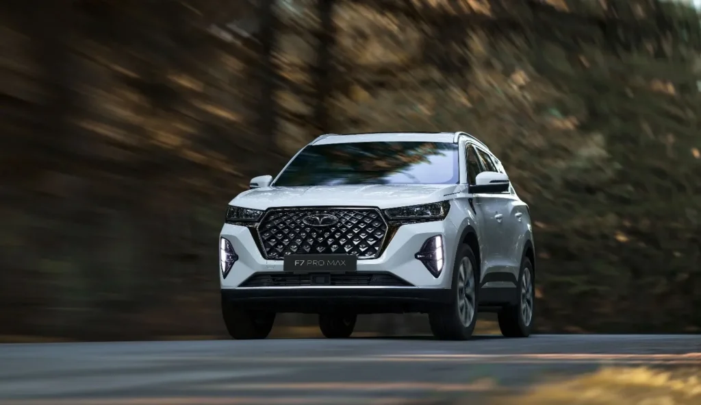 در اولین نگاه، اف ۷ پرو مکس مانند هر شاسیبلند مدرن دیگری بهنظر میرسد؛ با طراحی جسورانه، جلوپنجره کهکشانی و چراغهای LED باریک و الماسی که چهرهای مدرن و پویا به خودرو بخشیدهاند.