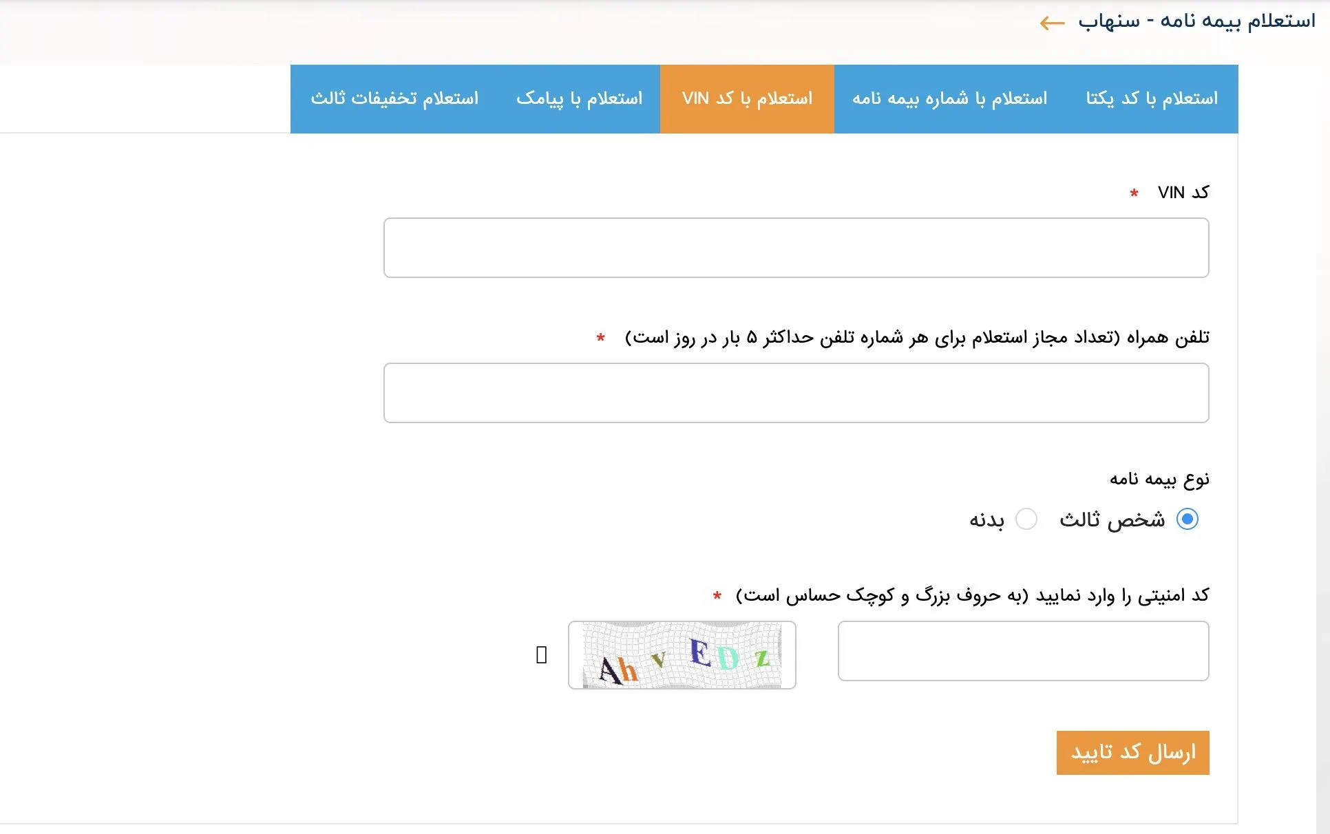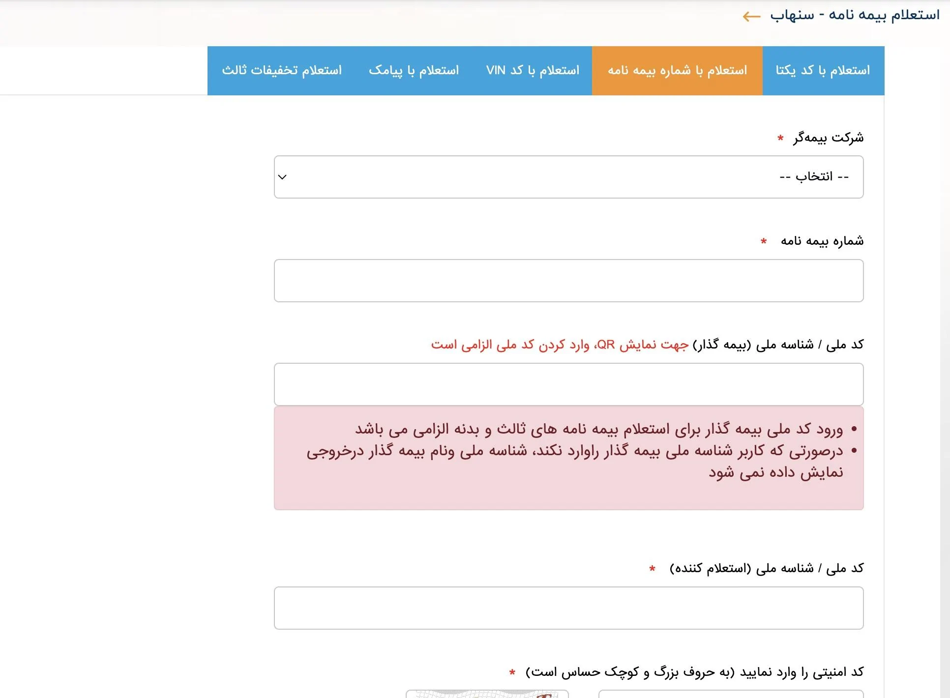 3. وارد کردن یکی از موارد، کد یکتای بیمه‌نامه، شماره بیمه‌نامه و شماره شاسی (VIN)