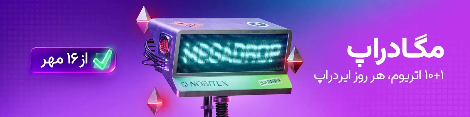 زمان انجام مأموریتها از ۰۰:۰۰ تا ساعت ۲۰:۰۰ هست. بعد از انجام مأموریت، رأس ساعت ۸ شب باید سریعتر از دیگران وارد صفحه جشنواره مگادراپ اتریوم نوبیتکس بشید و روی دکمه «دریافت جایزه» کلیک کنید. به جز جایزههای روزانه، با تکمیل ۵، ۸ یا ۱۰ مأموریت هم میتونید بدون قرعهکشی توی ایردراپ قطعی یک اتریوم شرکت کنید.