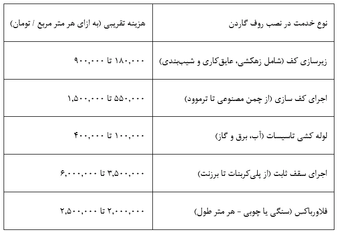 لازم به ذکر است که بنابر اطلاعات موجود میتوان گفت که هزینه طراحی و اجرای روف گاردن در سال پاییز سال 1404 برای یک فضای 100 متر مربعی به شرح لیست زیر است: