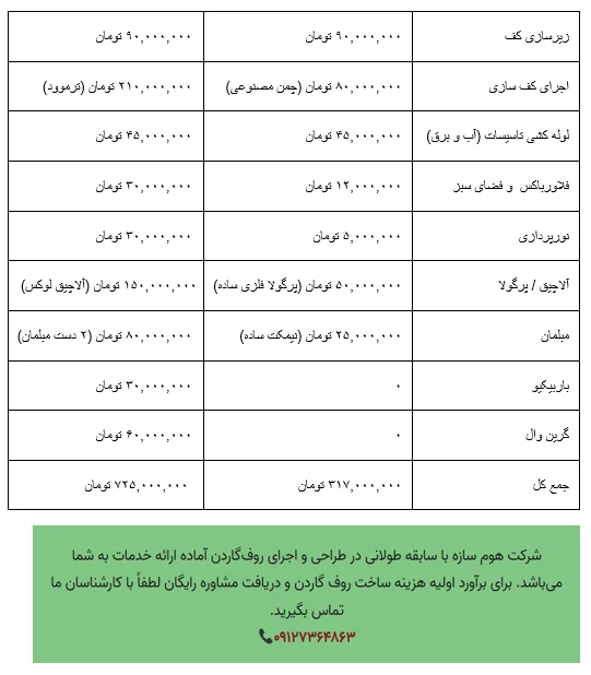 همانطور که میبینید، بازههای قیمتی بسیار متغیر هستند. این ارقام تقریبی هستند و هزینه اجرای روف گاردن در نهایت پس از بازدید کارشناس و بر اساس طرح سازه شما محاسبه میشود.