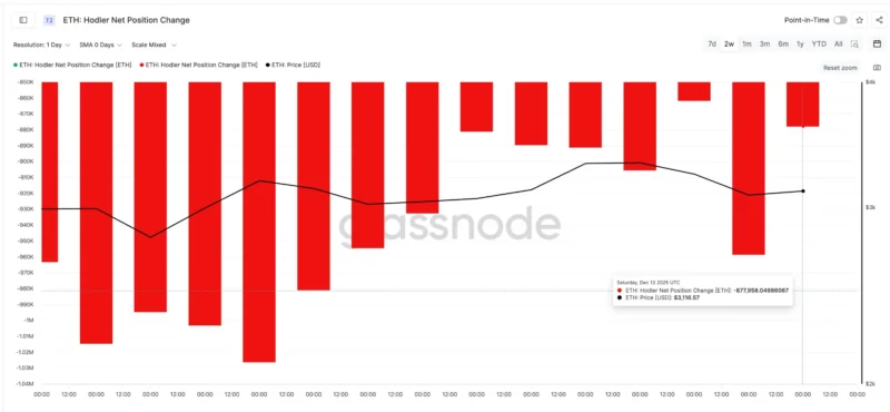 داده‌های آن‌چین و شاخص تغییر خالص موقعیت هولدرها حاکی از آن است که فشار فروش اتریوم به مرور زمان کاهش یافته‌ است. در تاریخ ۱۲ دسامبر (۲۳ آذر)، هولدرهای اتریوم حدود ۹۵۸٬۷۷۱ واحد ETH فروختند اما در روز بعد میزان فروش خالص به حدود ۸۷۷٬۹۵۸ واحد ETH کاهش یافت که نشان‌دهنده افت تقریبی ۹ درصدی فشار فروش طی ۲۴ ساعت است.